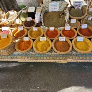 We came to Arles on the recommendation of my sister Marjie who has a bit of history in France. She claims it has the best farmer’s market she has ever attended, every Saturday if you’re interested. Agreed, I’ve never been to a better one, and it is the biggest. It is reported to be 450 stalls, a lot of them produce and about half of them food of some sort. The produce was overwhelmingly gorgeous and healthy looking. The only picture I have is this, spices.
