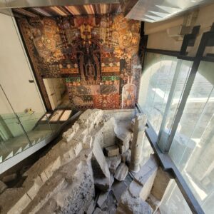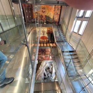 In the twentieth century it was renovated. I realize I have complained about the mix of modern and old at times. In this instance I am fascinated and impressed by what was created. To me it is totally original and striking. The Museum collections have been assembled and recomposed around two large backlit glass elevator like structures, and in about ten presentation wings. Hopefully, photos can convey this. Another part of the revamping is the restoration of the Jesuit Chapel, being attached to the museum and used as a setting for exhibitions. Included are dioramas, costumes of the 18th, 19th and 20th centuries, musical and festive objects, furniture, earthenware and more.