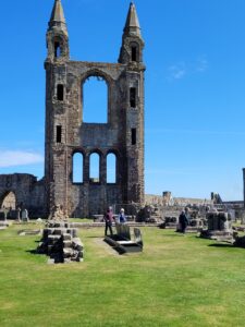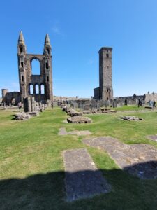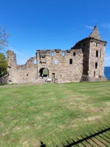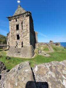 Thursday we drove to St. Andrews. Once again the GPS foiled my plans to take a direct route to St. Andrews , site of one of the most hallowed golf courses on earth. St. Andrews is a beautiful old town full of stone buildings built centuries ago. Two of the biggest tourist attractions are ruins, the church of St. Andrew and the castle, both built in the 1500’s, I believe. Not sure why, but, I quite enjoyed seeing them; just a typical tourist I guess. Pictures of the castle are below.