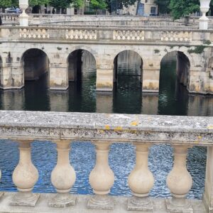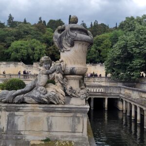 This morning, Sheila and I went on a field trip, Jardins de la Fontaine. It is an area where Nimes was first inhabited in 6th century BC near a sacred spring. First century B.C. the Romans showed up and began transforming the area with their construction. Much of what these photos show was constructed in the Roman period. The story continues that it was rediscovered in the 18th century and formal gardens were built around the archaeological remains. Later 19th century gardens were developed in English and Italian styles. Pictures of the canal and the entrance are below.