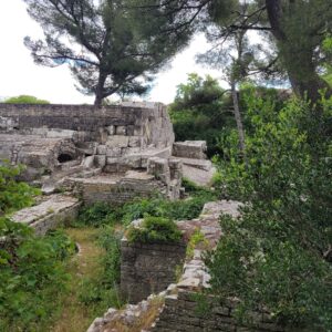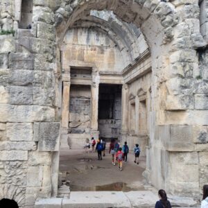 We are amazed at how many people are out on the streets at all hours of the day. Some are tourists, even though Nimes is not a heavily touristed area, a lot are school kids on field trips (it appears that much of the learning is outside the classroom), and then there are huge numbers of French people lounging, sitting and talking at the abundance of sidewalk, patio and smack dab in the middle of the street seating areas like the picture below. We do not go far before seeing another group of kids on a field trip. Below is a picture of kids on a field trip entering the Temple of Diane, the hunting goddess. Appears to be more leisure time here, hmmmm……