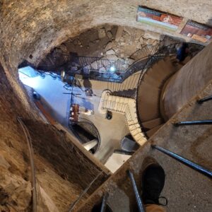 Next are views from the top of the tower. The one from the inside is from a point where I am already about halfway down. For your added enjoyment is an artfully constructed old bench.